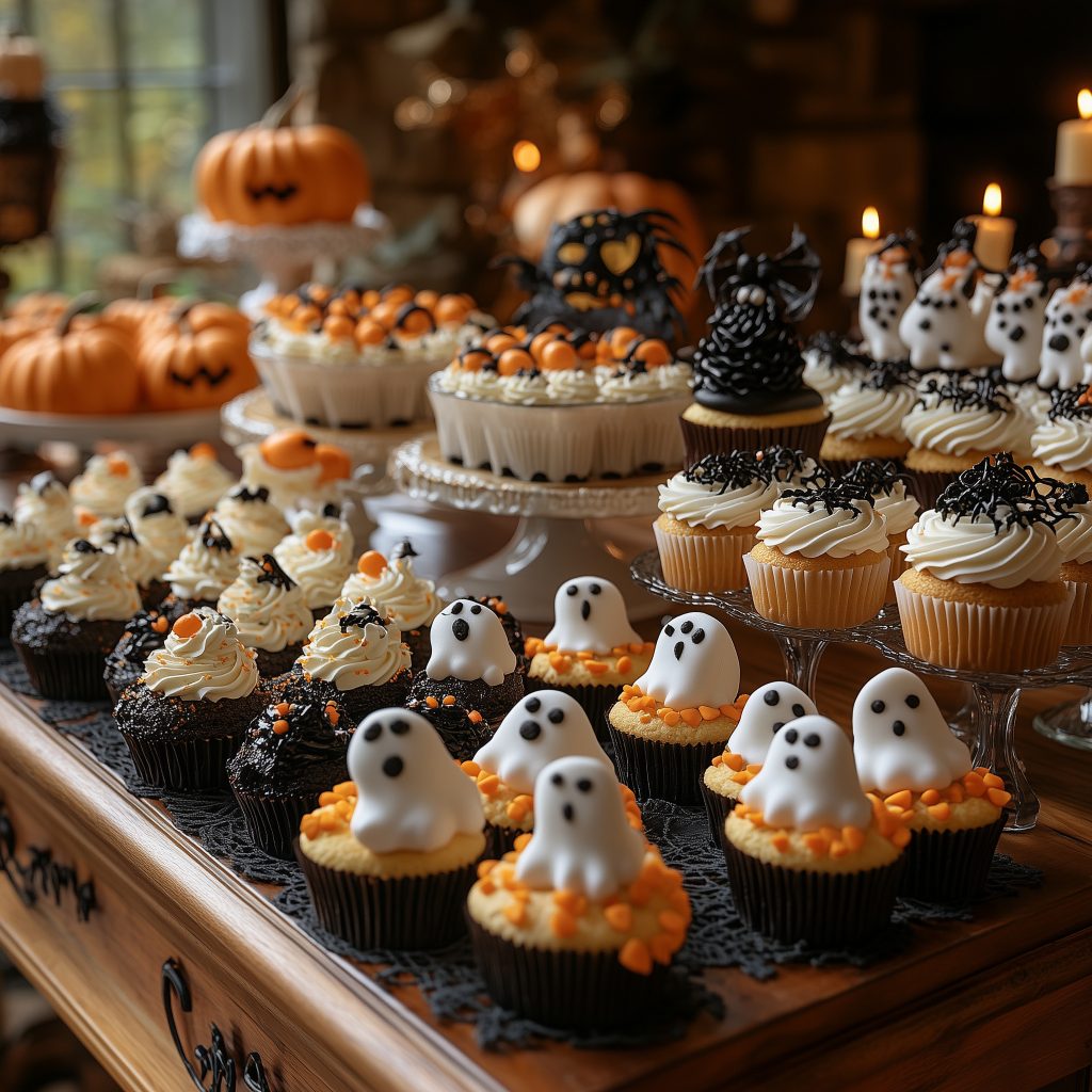 - Classique : noir, orange, blanc (citrouilles, toiles d’araignée, squelettes).